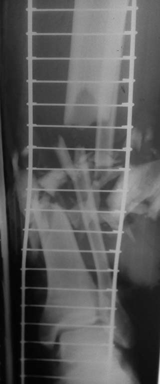 перелома мышечными пластами. Наложен стержневой аппарат наружной