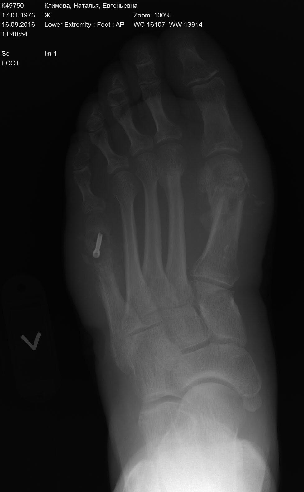 в проекции 1-й плюсневой кости открывается свищ. Пациентка амбулаторно