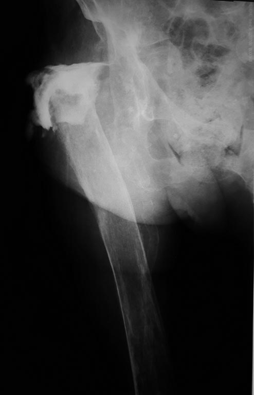 остатков цементной мантии из правой бедренной кости. Ведение раны