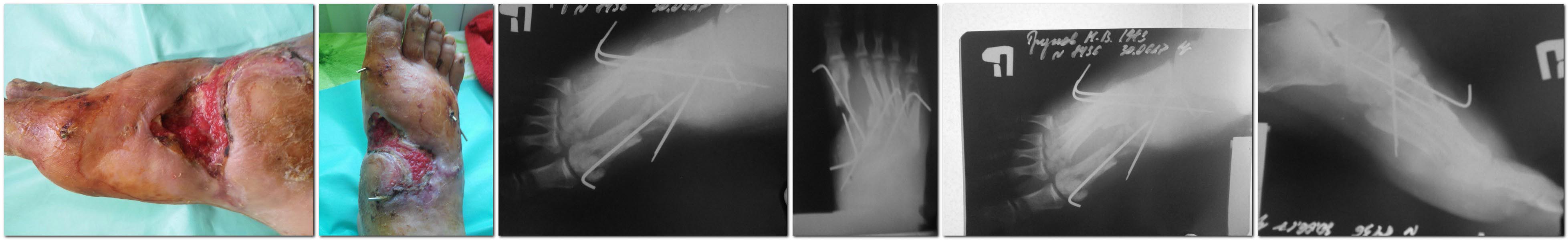 При поступлении выполнена ПХО с фиксацией спицами, далее перевязки и