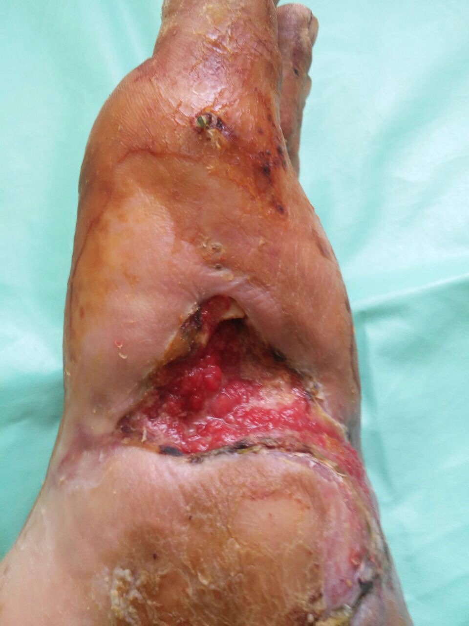 дефектом и "обнажённой" 1 плюсневой костью. Да, пациент страдает