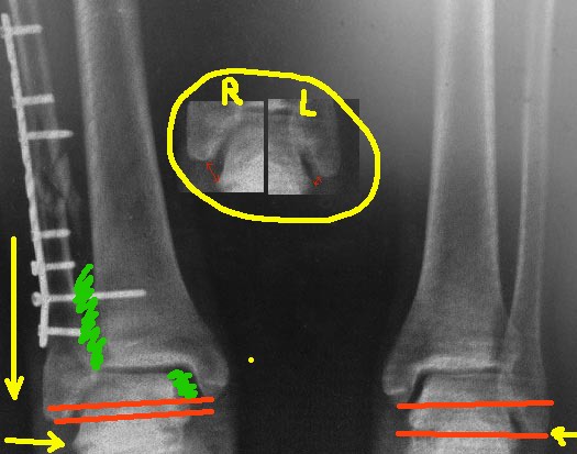 1. Лодыжка укорочена, это видно на прямой проекции, особенно в